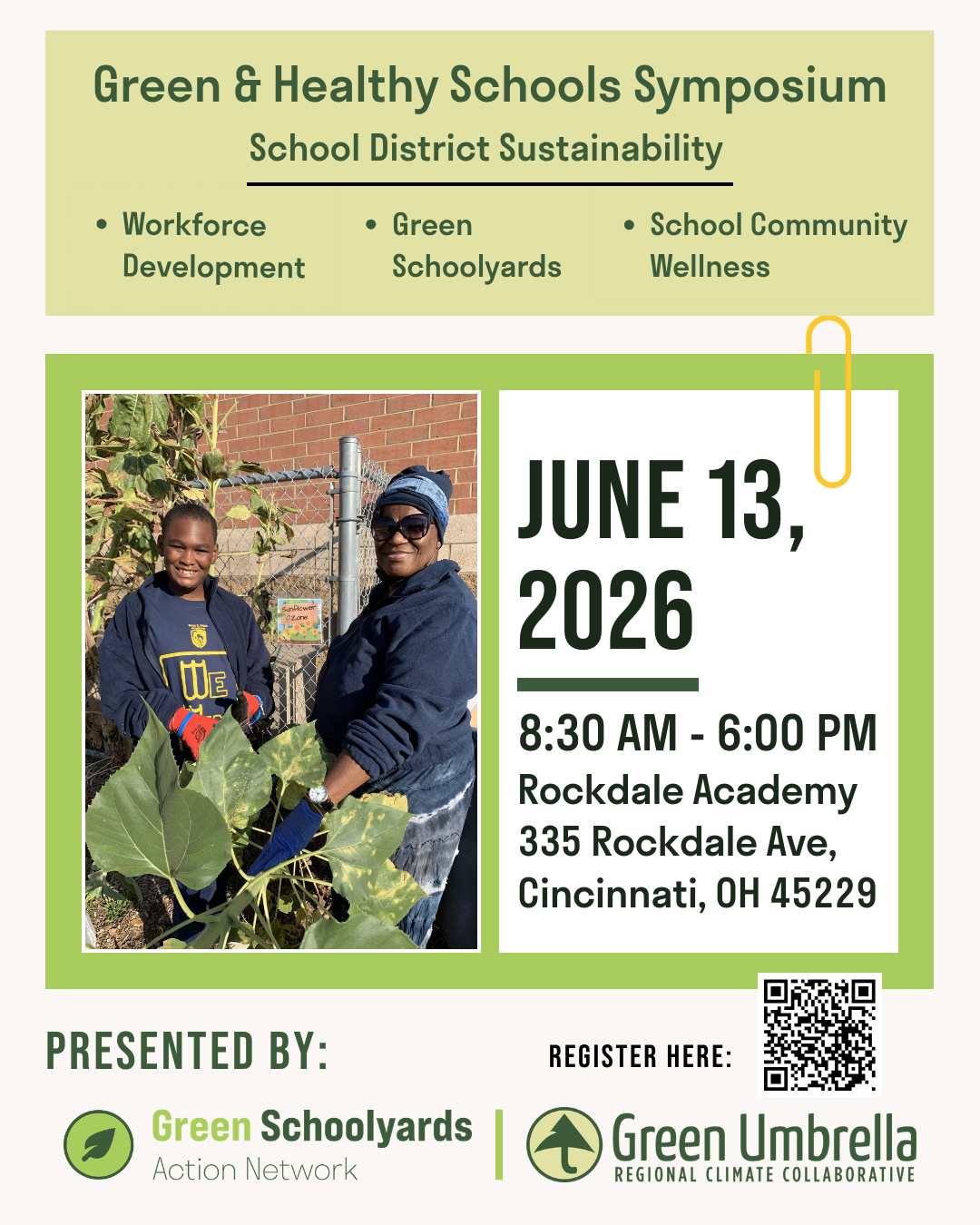 "Green Umbrella's Green & Healthy Schools Symposium will bring together visionary school district leaders- students, educators, and school food service staff- city officials, health agencies, and partner organizations to explore systems for sustaining outdoor learning and environmental practices throughout the school district."